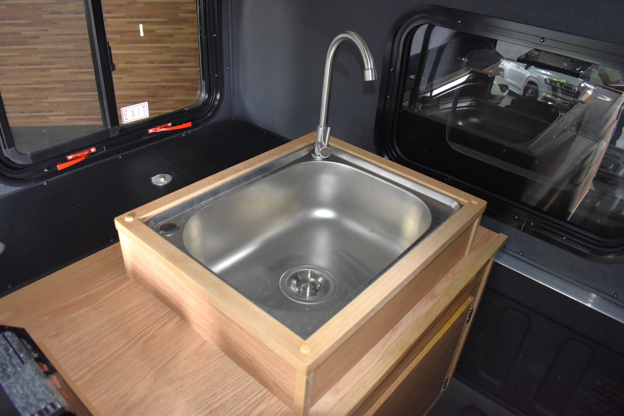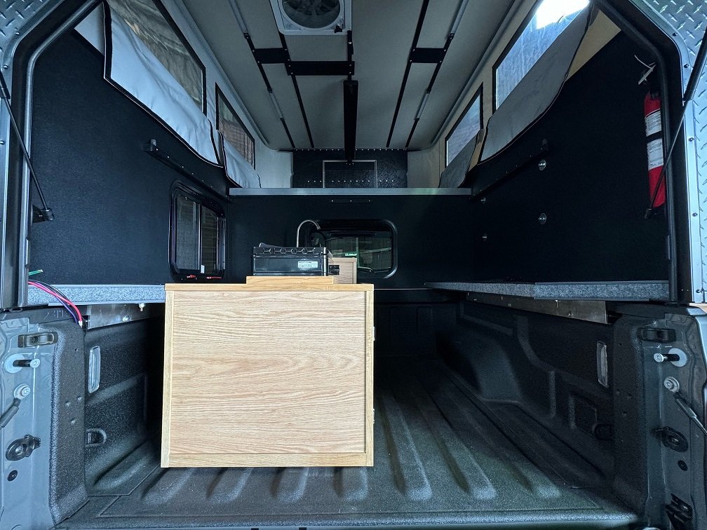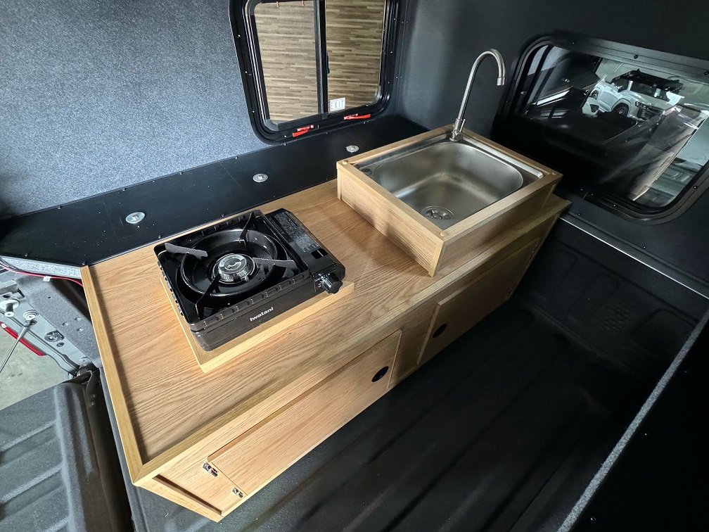 フロント電動ルーフベントファン キャブオーバーベッドブラックビニールマットレス YAKIMAルーフラックシステム 右側エクステリアギアトラックバー ウォータータンク トラクションボード 8ナンバーキット(シンク&コンロ)
